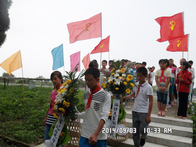 二是在9月3日紀念日當天,組織濱湖小學40余名師生來到溫家套慘案紀念碑,共同祭奠緬懷戰爭中的死難同胞。紀念碑前,學生們在輔導員的帶領下重溫了入隊誓詞。隨后,濱湖小學校長莢長紅向少先隊員們講述了慘案發生經過,勉勵學生們勿忘國恥,努力學習,全面成才,為共圓“中國夢”貢獻力量。隊員們紛紛表示,要不忘先人,刻苦奮斗,為祖國的繁榮富強發展做出自己的貢獻。(中垾鎮 項翔)