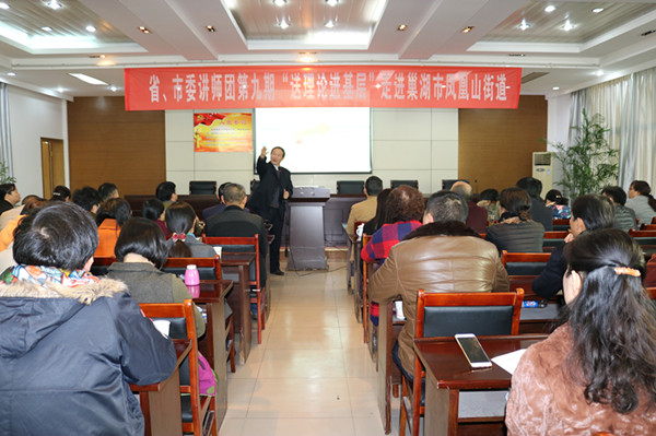11月22日下午,省、市委講師團宣講專家、合肥市委黨校教授江浩來到巢湖市鳳凰山街道,為轄區廣大黨員干部作黨的十九大精神專題輔導報告。來自街道、社區及23個黨建聯盟成員單位的120名黨員干部聆聽了宣講。