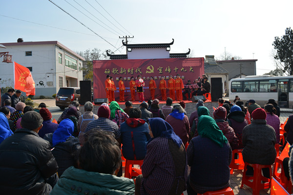為積極推動黨的十九大精神進進機關、進鄉村、進社區、進校園、進企業,柘皋鎮組建“新時代”文藝小分隊,編排了一系列主題文藝節目,在元旦、春節期間持續開展文藝巡演活動,用文藝的形式把黨的十九大精神傳遞到千家萬戶。