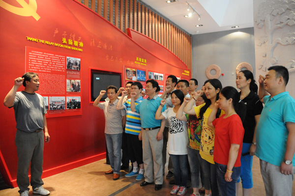 “我志愿加入中國共產黨,擁護黨的綱領,遵守黨的章程……”,在沈浩同志事跡陳列館里,巢湖地稅的全體黨員干部在鮮紅的黨旗下,懷著崇敬的心情,莊重的舉起右手,重溫了入黨誓詞。