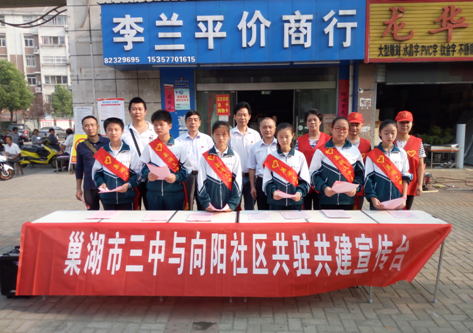 9月24日上午,在向陽苑B區南大門舉辦了“巢湖市三中與向陽社區共駐共建宣傳臺”暨“黨建惠民”區域化黨建聯盟活動,來自市三中、向陽社區等單位的志愿者開展了社會主義核心價值觀、環保進社區、禁燃禁放、消防安全等多項“創城”宣傳活動。