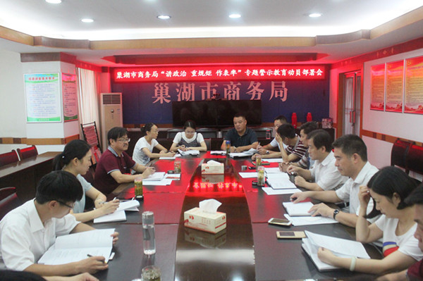 近日,市商務局召開“講政治、重規矩、作表率”專題警示教育動員部署會議,機關全體黨員干部和各基層黨組織書記參加。會議傳達學習了《中共巢湖市委“兩學一做”學習教育協調小組關于印發〈關于在全市黨員干部中開展“講政治、重規矩、作表率”專題警示教育的實施方案〉的通知》(巢學組發〔2017〕2號)文件精神,宣讀了巢湖市商務局《關于在全局黨員干部中開展“講政治、重規矩、作表率”專題警示教育的實施方案》,對全局開展“講政治、重規矩、作表率”專題警示教育進行動員部署。