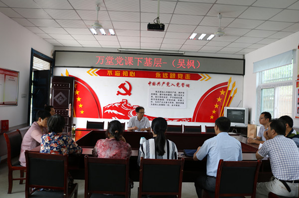 為貫徹落實上級黨組織有關部署要求,推動“兩學一做”常態化學習教育深入開展,近日,巢湖市編辦來到欄桿集鎮石門村開展“萬堂黨課進基層”活動。黨課由編辦副主任、黨支部組織委員吳楓同志主講,石門村兩委和編辦全體黨員參加聽課。