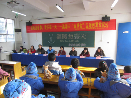 元月6日上午,以“啟動溫暖季,愛在每一天”為主題的壹基金溫暖包發放式在巢湖市新華學校多功能階梯教室內舉行。本次活動由壹基金聯合救災安徽項目組、安徽民間救災行動網絡和巢湖市婦聯共同主辦,市政協副主席耿艷,壹基金聯合救災安徽項目組、安徽民間救災行動網絡協調人張軍,市委組織部副部長翟大成,市婦聯主席朱四紅等領導參加了此次發放儀式。